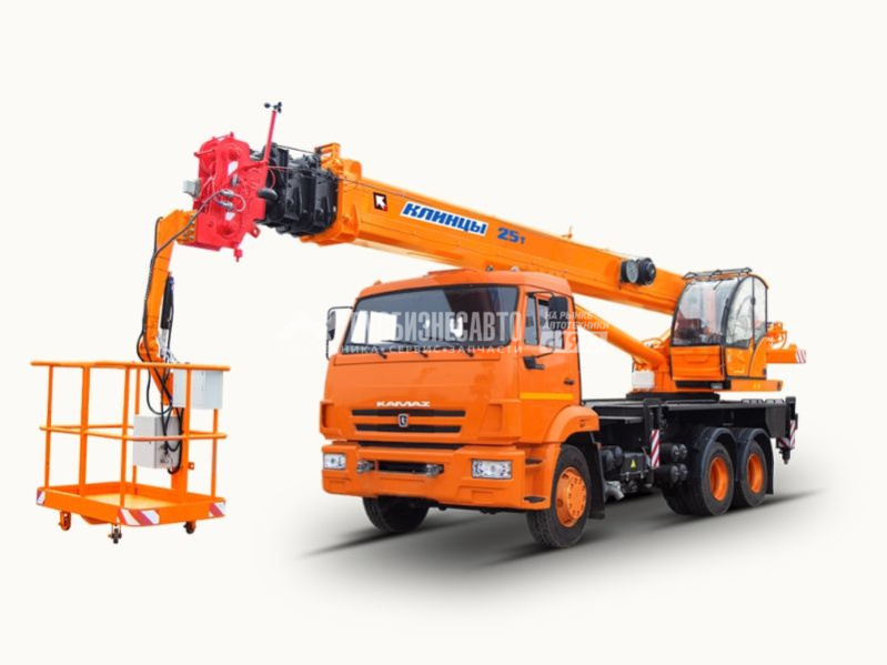 Модель шасси - КамАЗ 65115; Колес.фор. - 6х4; Тип двиг. - дизельный; Раб.высота подъема - 28 м; Макс.вылет люльки - 19 м; Грузоподъемность 25т, шасси КАМАЗ-65115, стрела 28 м., груз-ть люльки - 250 кг; высота подъёма люльки 31 м., гарантия на кран 18 месяцев или 1000 м/ч