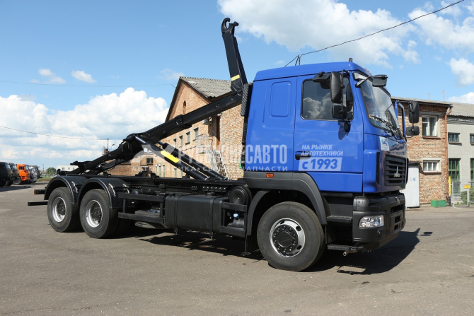 Базовое шасси МАЗ 631228-8575-012 (Евро-5) Колесная формула 6х4 Модель двигателя Weichai Power (423 л.с.) Модель КПП Fast Gear (12 ступенчатая) Модель системы крюкового захвата HYVALift T20-57 Грузоподъемность    20000 кг Максимальный угол подъема     48 град. Допустимая длина контейнера    7000 мм Время погрузки/ опрокидывания кузова    44/49 с Рабочее давление гидравлической системы    315 бар
