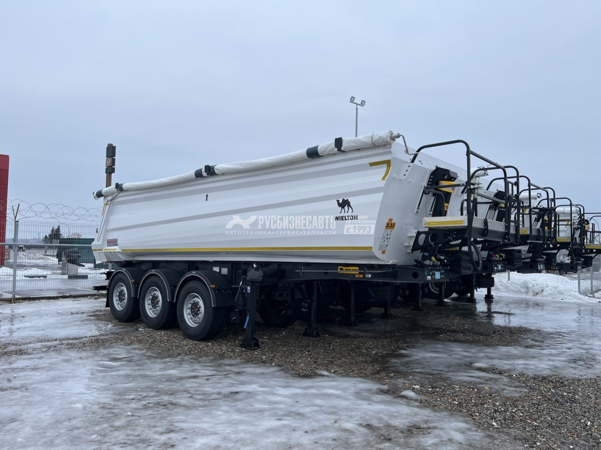 Cамосвальный стальной полуприцеп Wielton NW 3 объемом 26 м3, ССУ 1200, оси SAF - 9000 кг, дисковые тормоза, автоматическая передняя подъемная ось, грузовой отсек изготовлен из листового металла HB 450 стены – 4,5 мм, пол – 4,5 мм, задний затвор - откидной борт, шины 385/65 R 22,5, собственнй вес 6600 кг, г/п - 32 400 кг.
