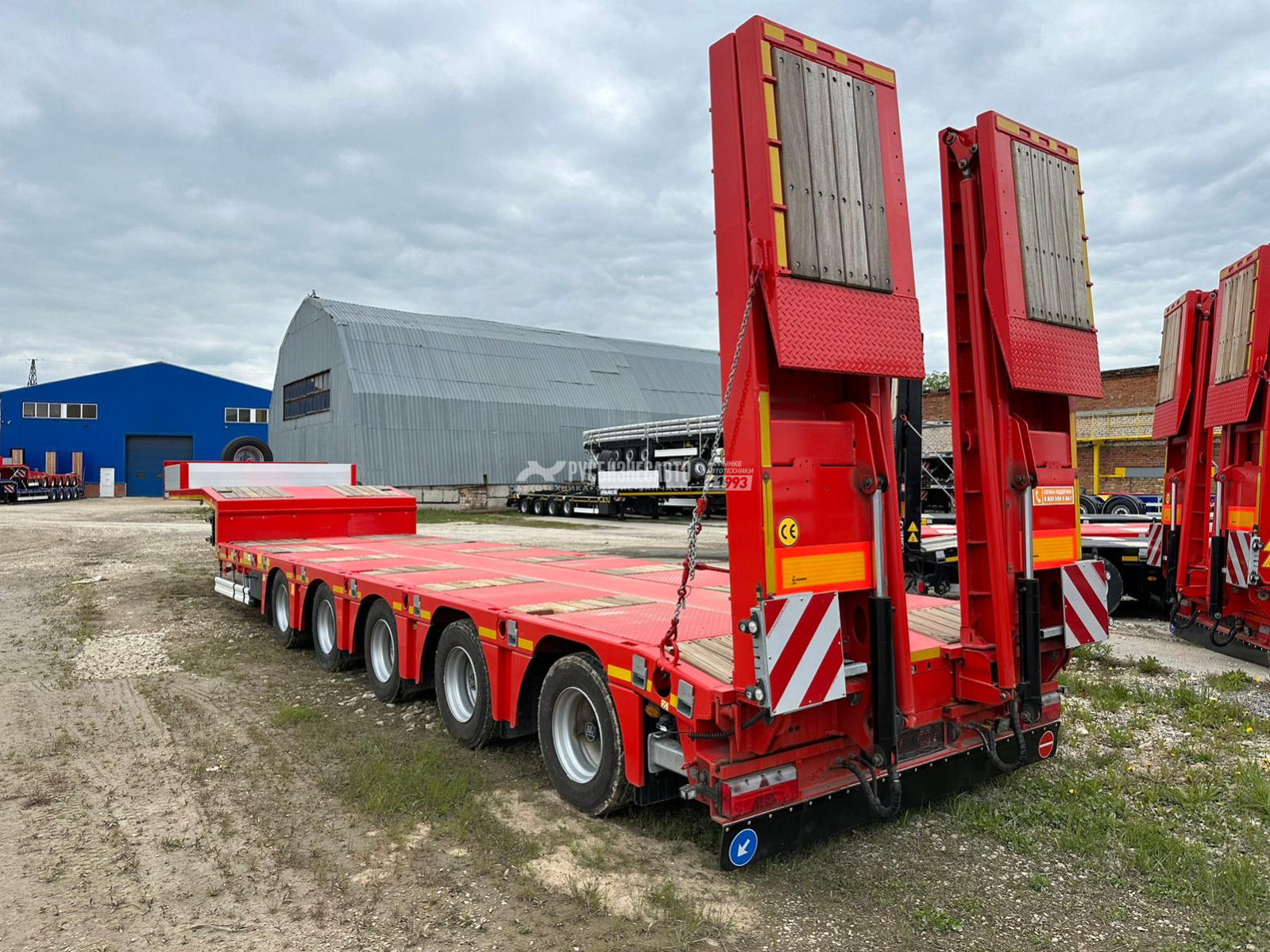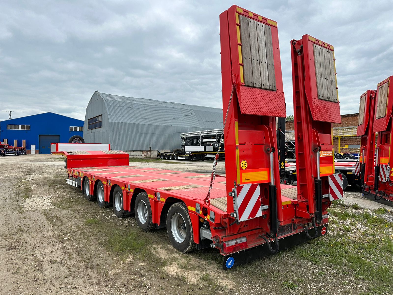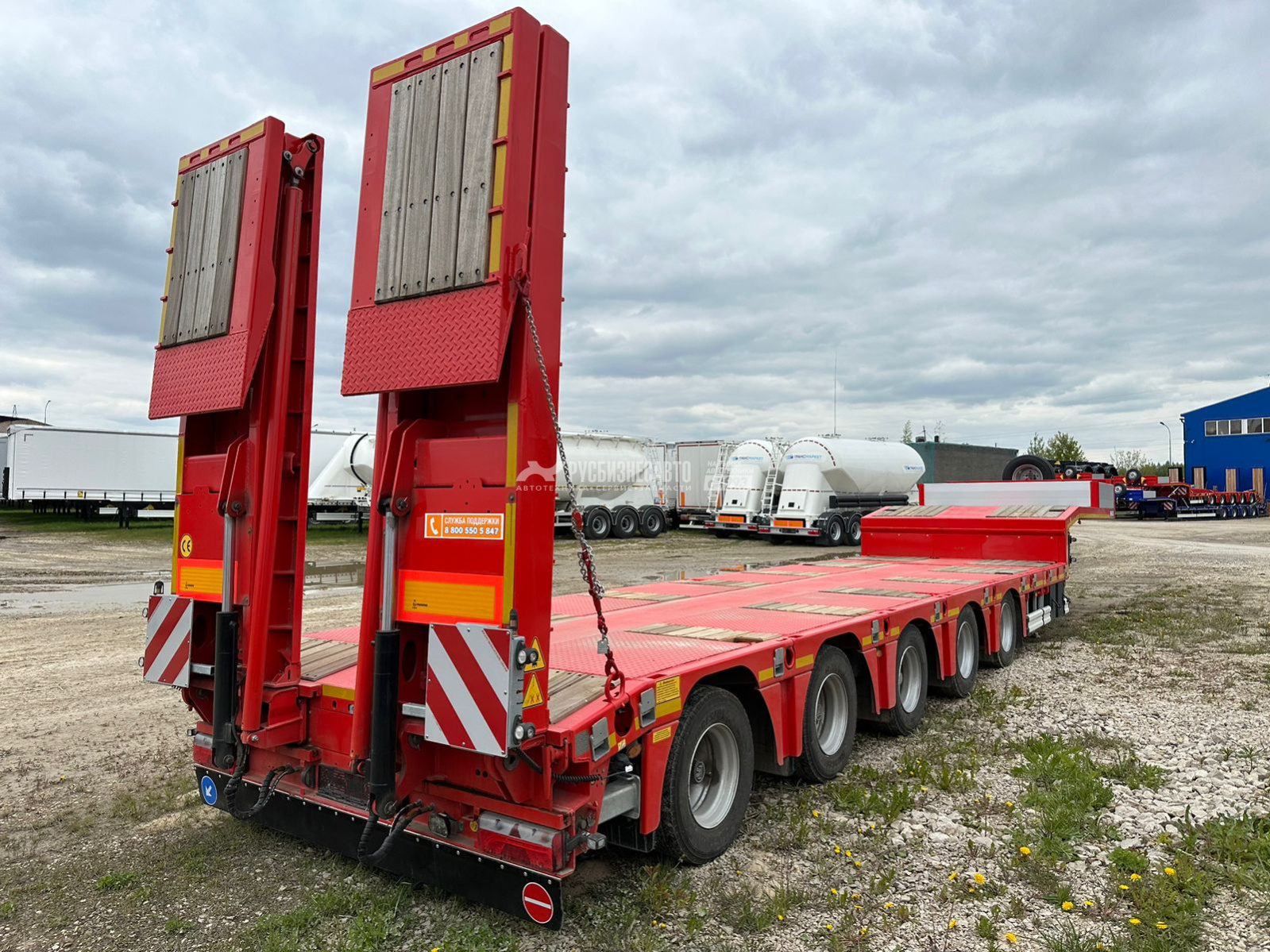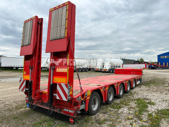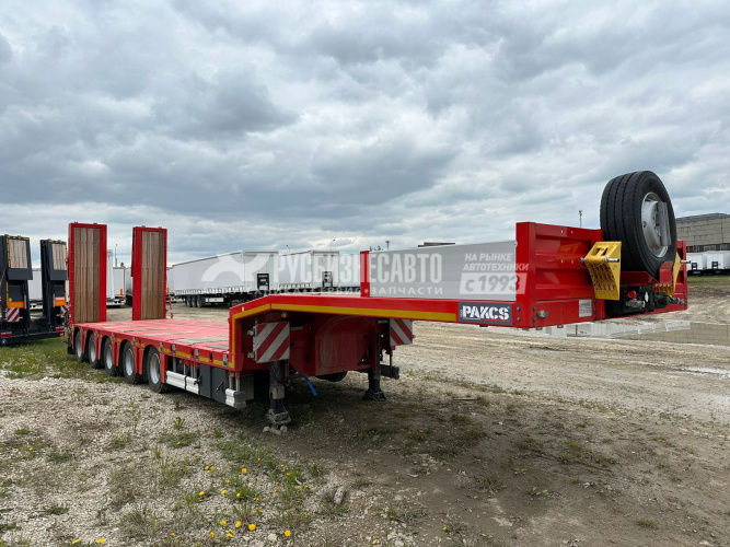 Низкорамный трал ISO PAKCS трал 5 осей раздвижной с уголом заезда 10 градусов, 1-я и 2-ая оси подъемные, 4-ая и 5-ая подруливающие, оси BPW 10 т. пневмоподвеска с барабанными тормозами, полная масса 74 000 кг (по ЭПТС) при скорости движения 80 км/ч, полная масса 80 200 кг при скорости движения 60 км/ч, собственная масса 15 450 кг, длина платформы погрузочная 9240 мм + 6000 мм раздвижение с фиксацией каждые 500 мм, ширина общая 2 550 + 600 (уширители с фиксацией каждые 100 мм), гидравлические аппарели двойного сложения, собственная гидростанция с работой от АКБ тягача, отверстия для коников 8 х2 шт. 52 мм. х 102 мм., двойной инструментальный ящик с ПВХ покрытием, несъёмный передвижной стол 300 мм