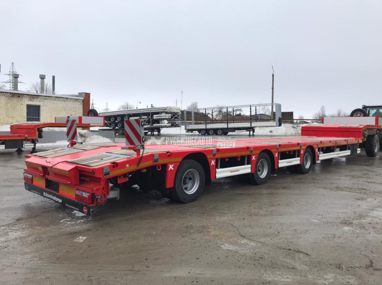 Низкорамный трал Kassbohrer LB3A , 3 оси без радвижения с уголом заезда 18 градусов, приставные аппарели (нагрузка на аппарели 40 тон), без подъемной оси, 3-я ось подруливающая, оси BPW 9 т., пневмоподвеска с барабанными тормозами, полная масса полуприцепа 48 000 кг (при скорости движения 80 км/ч), 52 800 кг (при скорости движения 60 км/ч), длина платформы 12 000, длина гуська 3 950 мм, ширина общая 2 550 + 600 (уширители с фиксацией каждые 100 мм), отверстия для коников (без коников), отверстия для контейнерных замков (сами замки в комплекте не идут, возможна перевозка контейнеров 20 ft, 30 ft), двойной инструментальный ящик с ПВХ покрытием.