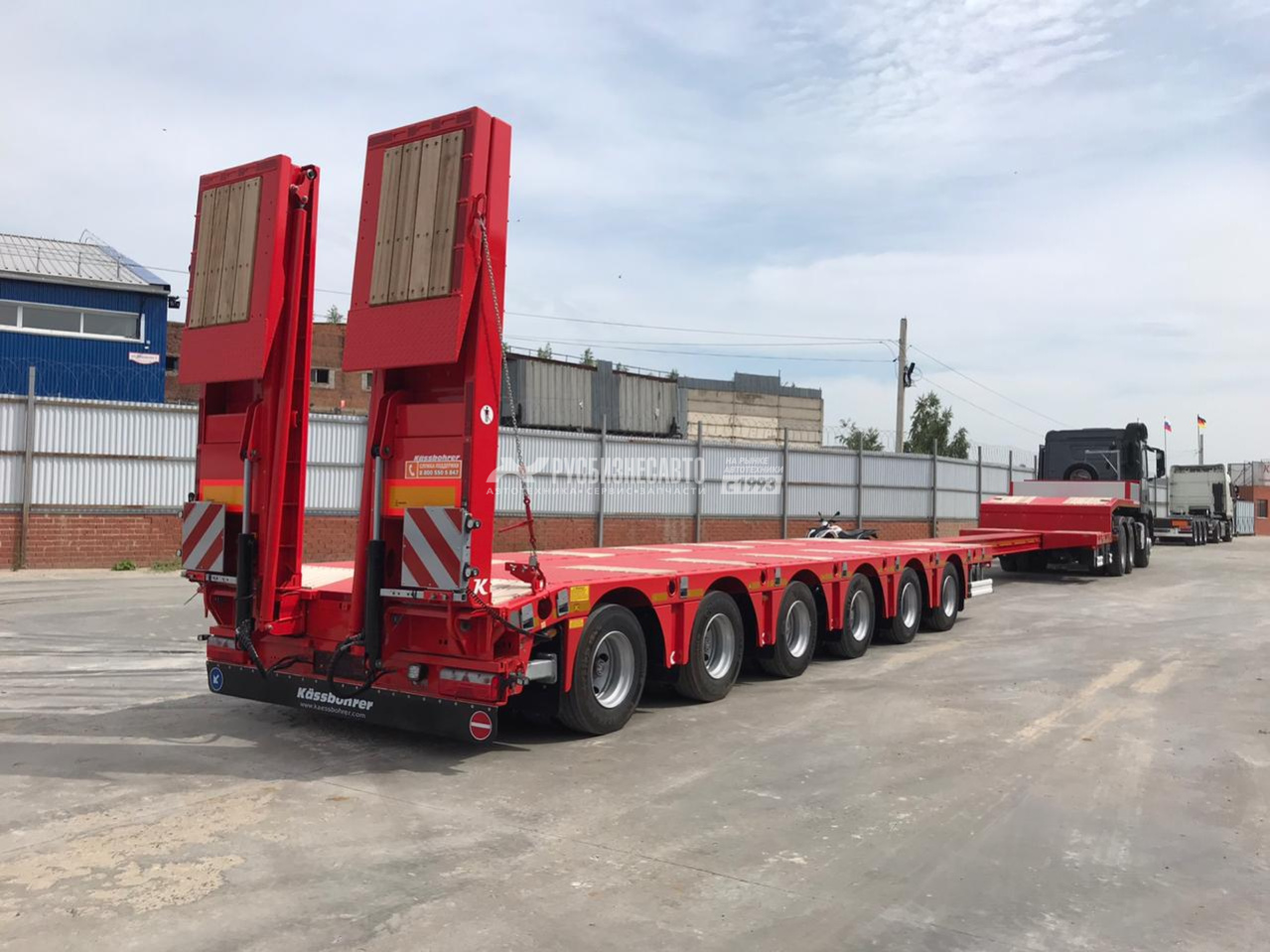 Низкорамный трал 6 осей, г/п 66 272 кг (при скорости движения не более 100 км/ч, собственная масса 17728 кг, оси 11 тон BPW с пневмоподвеской и барабанными тормозами, первая и вторая ось подъемные, пятая и шестая оси подруливающие, аппарели двойного сложения с углом заезда 12 градусов, отверстия под коники, боковые уширители.