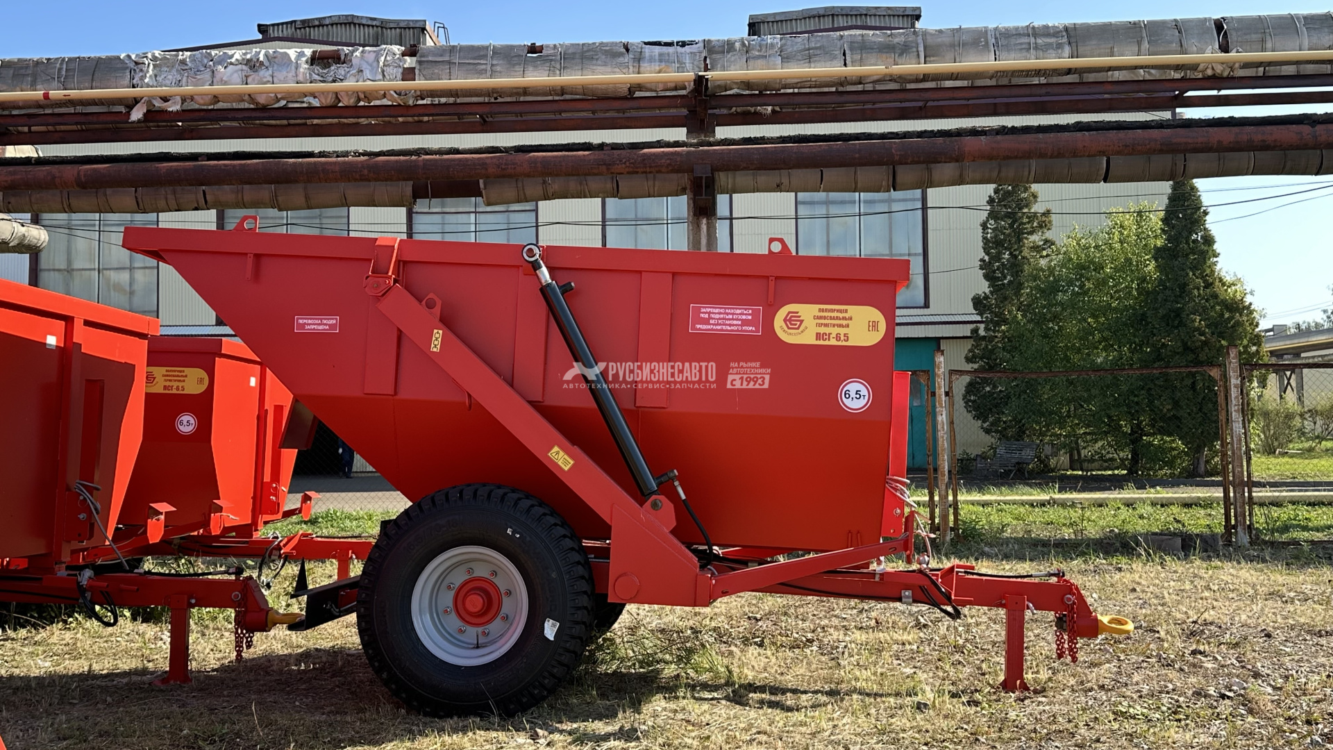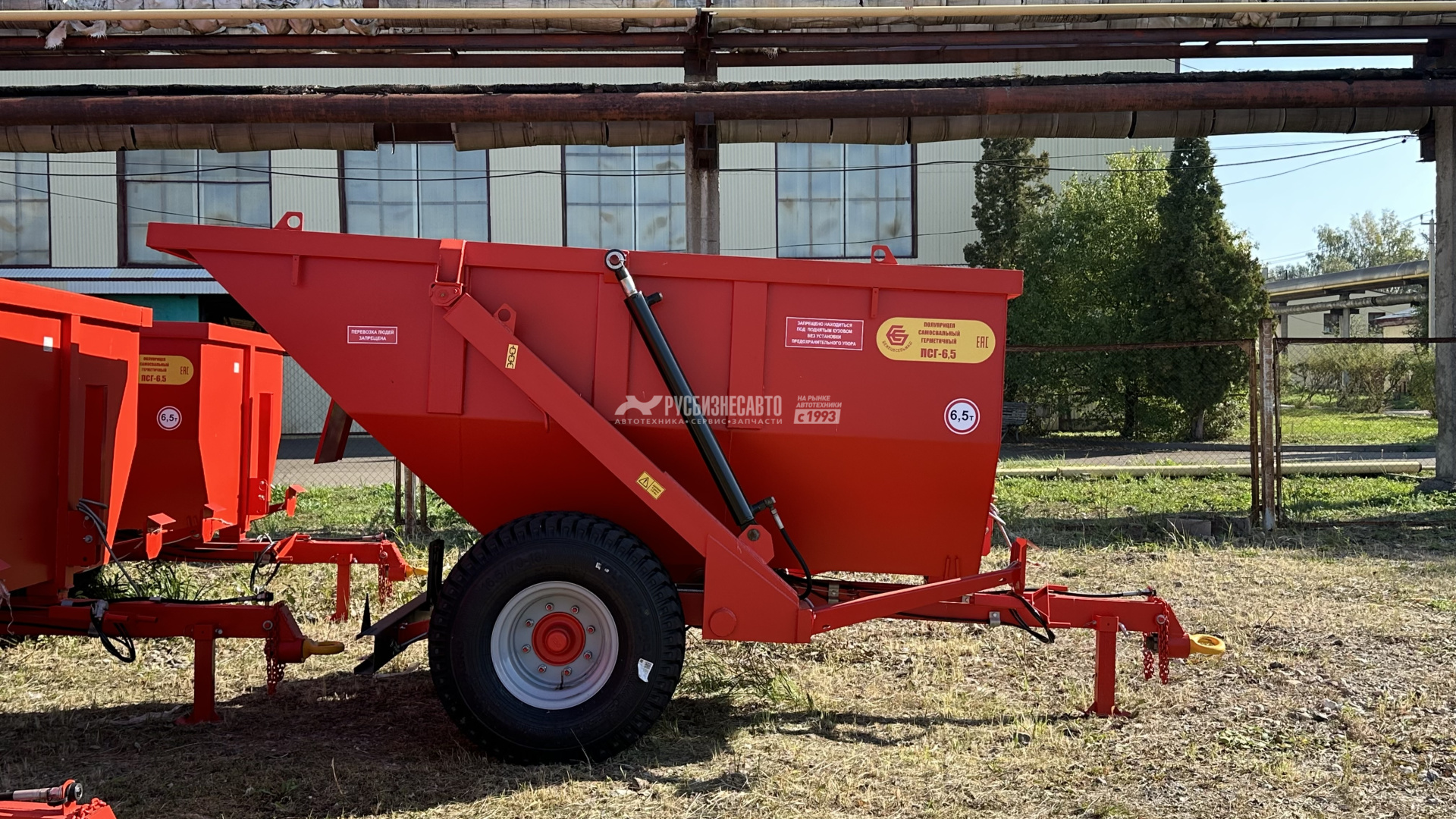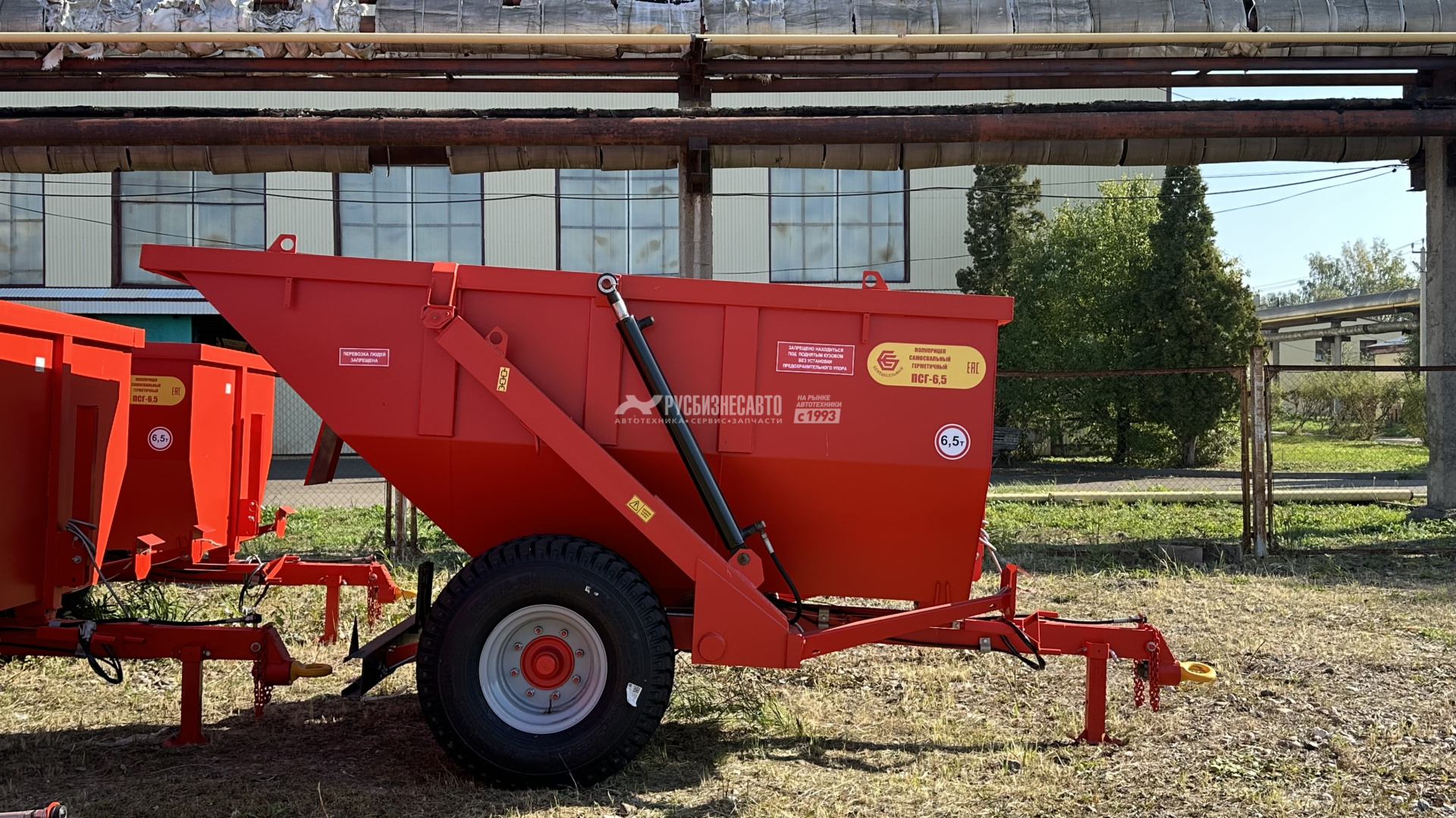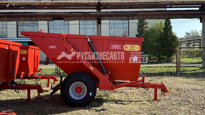 6.5Полуприцеп самосвальный герметичный является универсальным,всесезонным транспортным средством и предназначен для перевозки ивыгрузки назад сыпучих, жидких и полужидких сельскохозяйственных истроительных грузов. Снабжен двумя гидроцилиндрами подъема кузова,работающими от гидросистемы трактора. Толщина металла составляет 4 мм.Комплектуется итальянским мостом.
